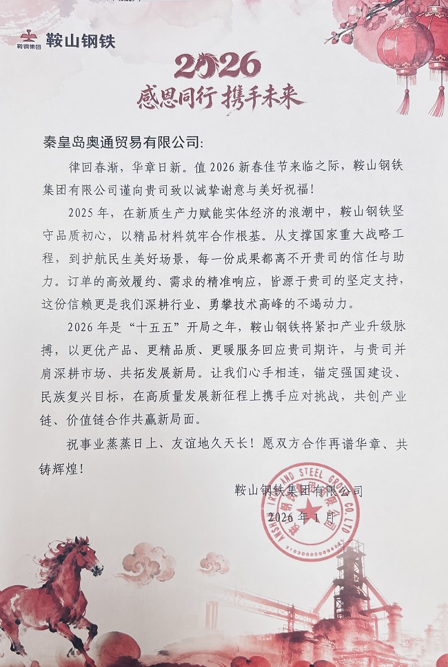 近日,我司秦皇島奧通貿(mào)易有限公司收到來自鞍山鋼鐵集團有限公司的2026年新春賀函。這份來自國內鋼鐵行業(yè)領軍企業(yè)的誠摯祝福,既是對過去一年合作成果的高度認可,也是對雙方未來共贏發(fā)展的深切期許。